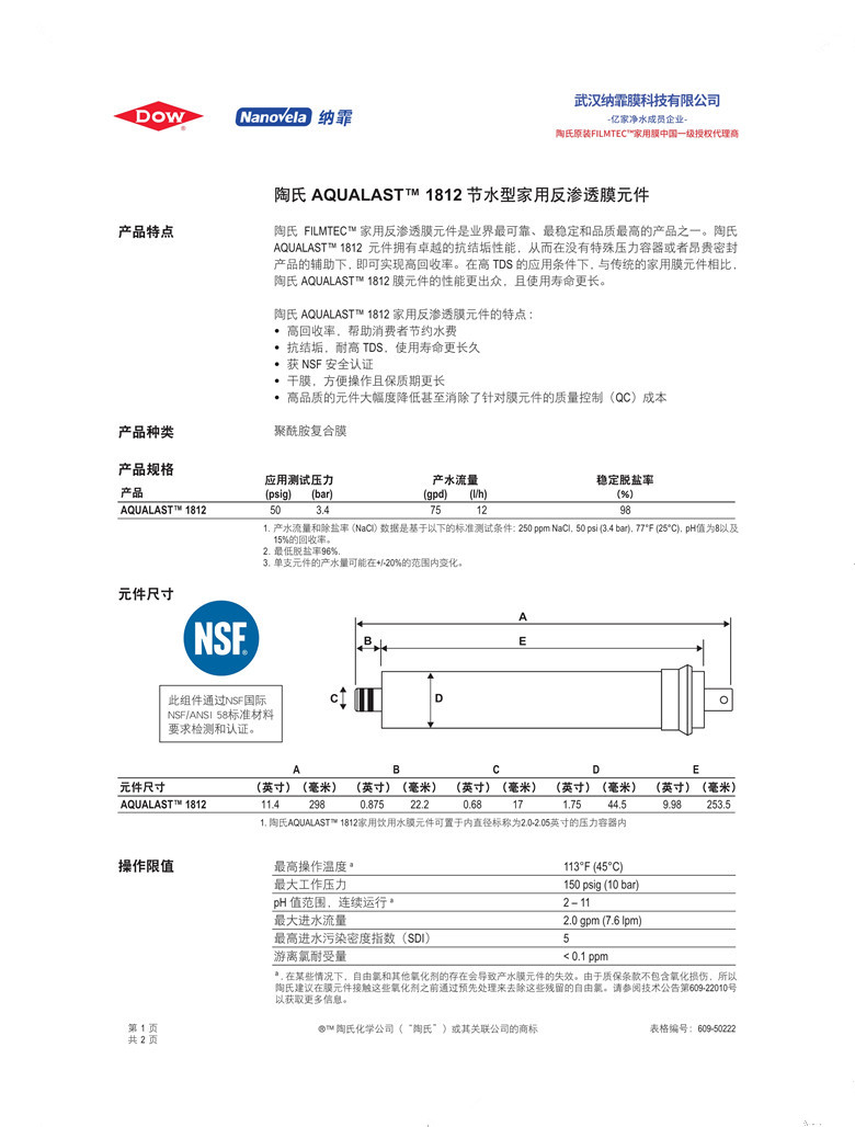 陶氏原裝 AQUALAST1812 節水型家用 反滲透膜元件